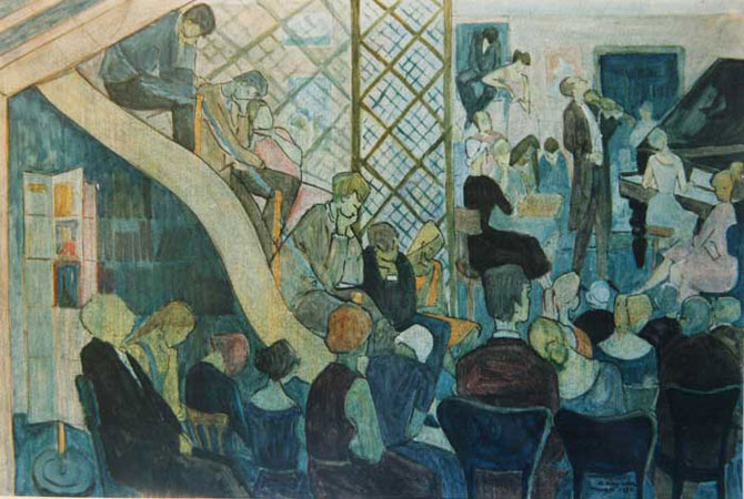 Concert in Munich, Book Store, Oil on Cardboard, 50x74cm, 1958